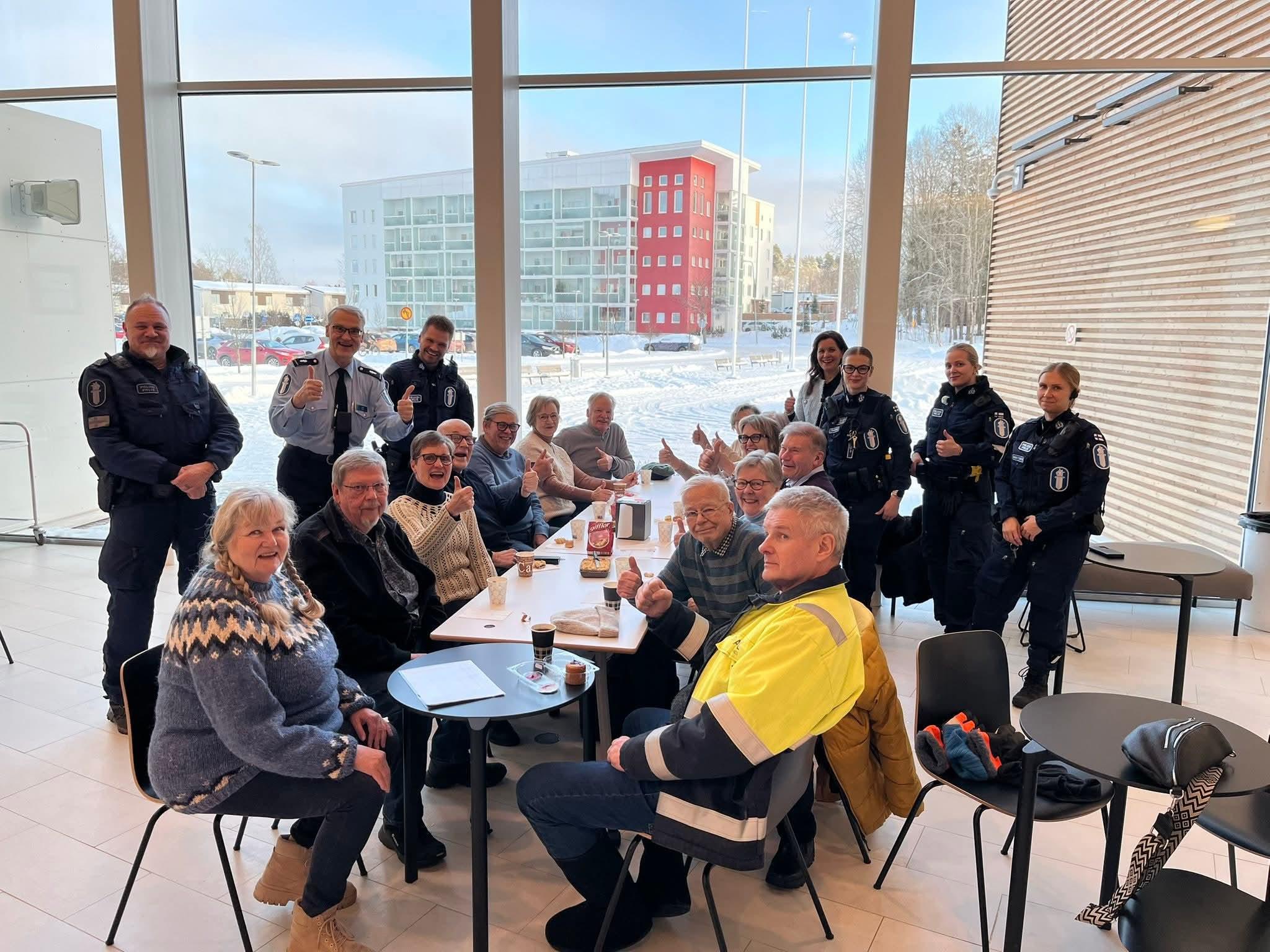Yhteisiä torstaikahveja Monikon Mustikassa jatkettiin 29.1. Tilaisuutta juhlisti paikalle tulleet kunnanjohtaja Outi Mäkelä, poliisiryhmä Helsingistä sekä iso määrä Klaukkalan koulujen oppilaita. Oppilaat olivat kuulemassa Poliisien soittokuntaa samassa tilaisuudessa, jossa poliisit valistivat nuoria elämän tosiasioista.