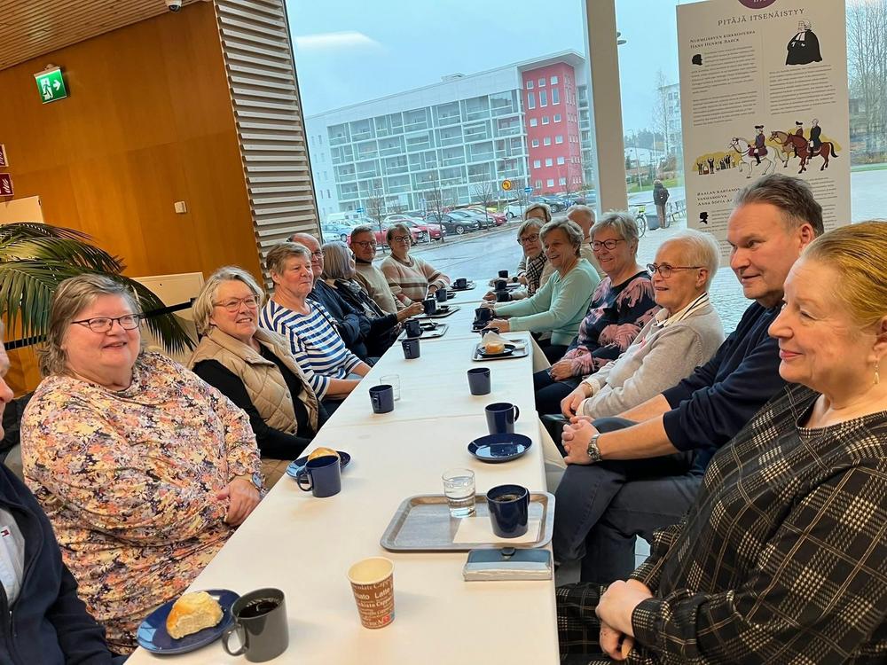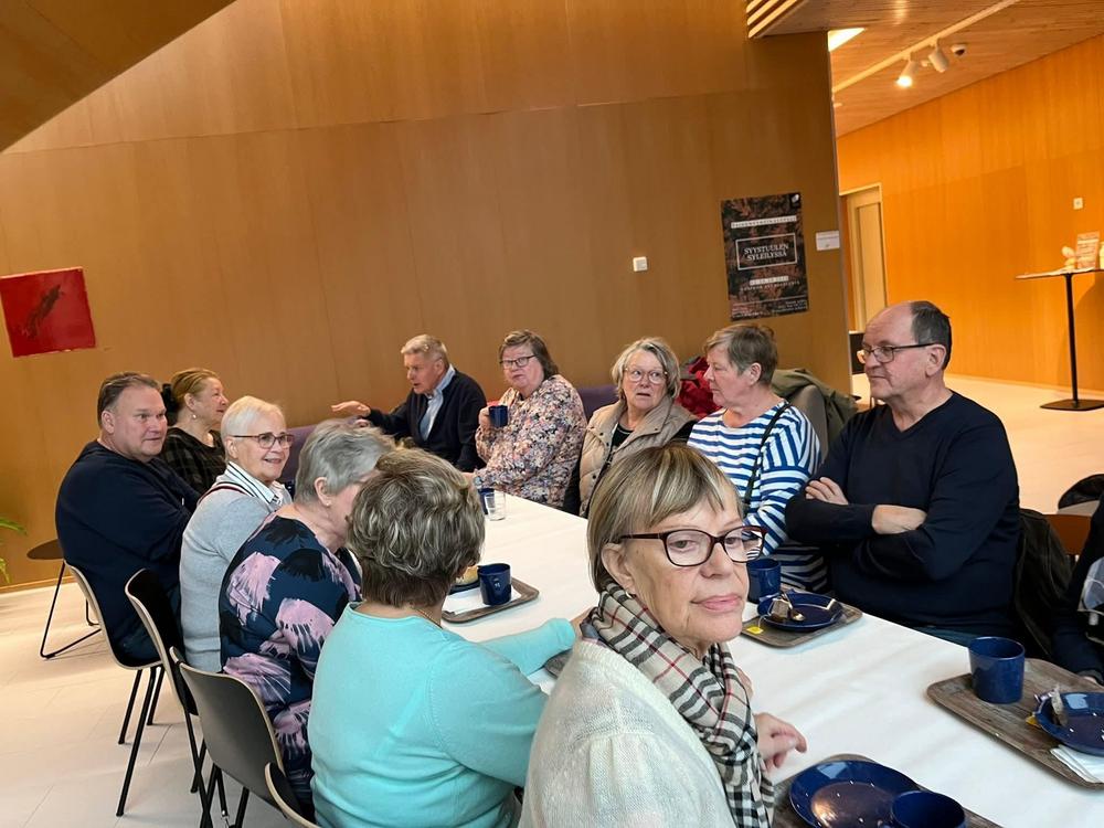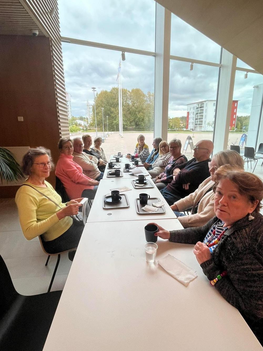 Yhteinen "torstaikahvit"-tilaisuus houkutteli jälleen 25.9. toistakymmentä senioria Monikon Mustikkaan. Pöydässä kävi iloinen puheensorina.