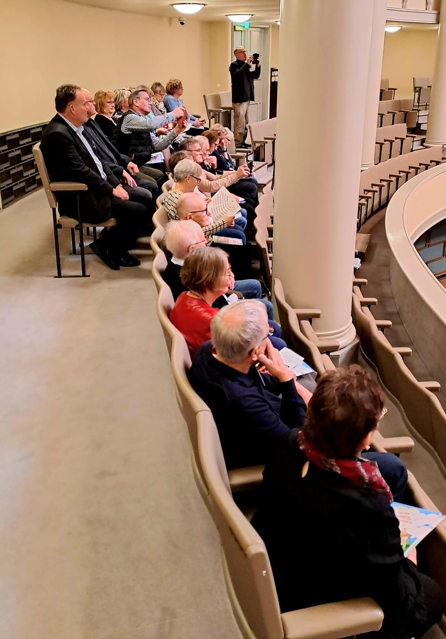24 Klaukkalan senioria kävi 21.10. eduskuntavierailulla. Turvatarkastuksen jälkeen tutustuimme virallisen oppaan avustuksella taloon edeten kerroksittain ylöspäin. Keskustelimme talon historiasta ja rakennusratkaisuista. Istuntosaliin ja sen käytäntöihin tutustuimme lehteriltä. Lopuksi päädyimme keskustelemaan kansanedustaja, sosiaali- terveysvaliokunnan varapuheenjohtaja Mia Laihon kanssa sote- ja muusta ajankohtaispolitiikasta Kokoomuksen ryhmähuoneessa. Osa meistä jäi vielä seuraamaan täysistuntoa.