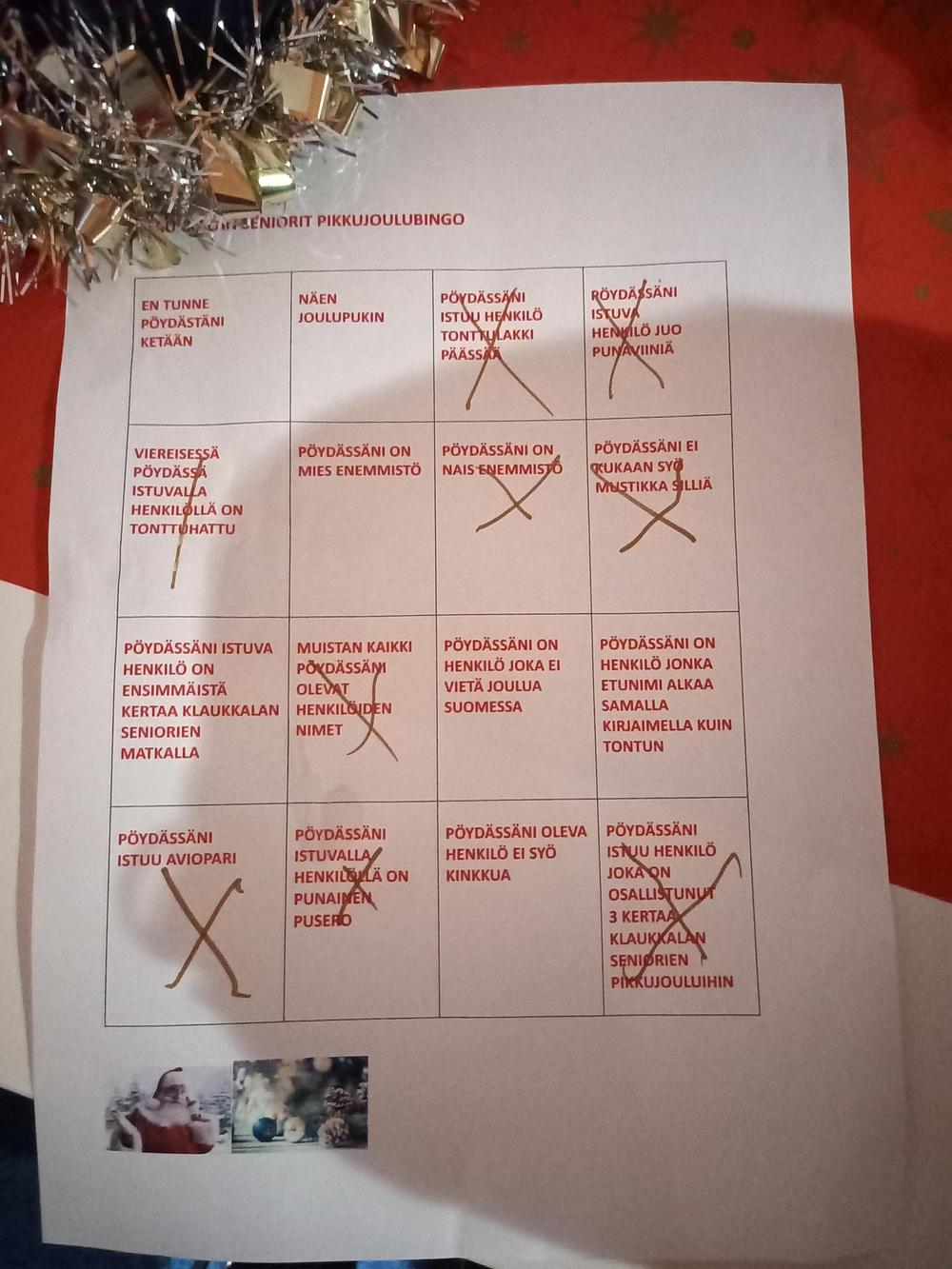 Ruokailun lomassa pöytäkunnat kokeilivat paremmuutta bingossa. Ei unohdettu myöskään vanhoja tuttuja joululauluja. Pj. Merja kiitti lämpimästi yhdistyksen jäseniä kuluneesta aktiivisesta ja mukavasta vuodesta. Hän sai jäseniltä myös vastavuoroisesti ansaitut kiitokset omasta toiminnastaan.